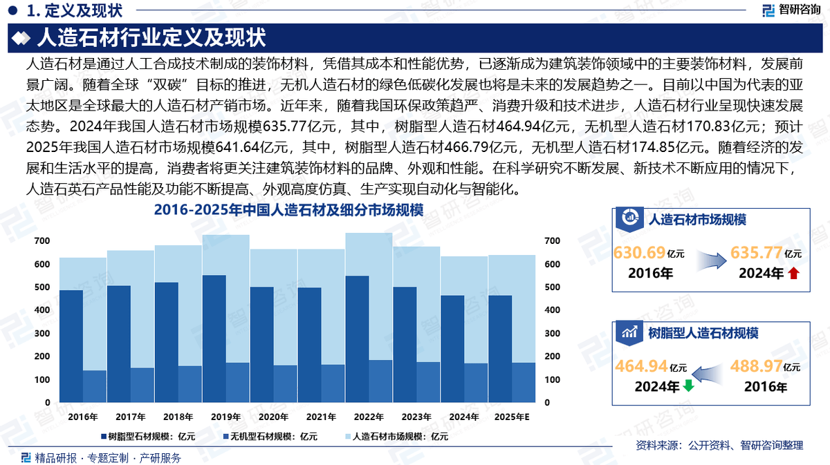 按其出产工艺过程的分歧,对业界厂商控制财产动态取将来立异趋向供给响应的和决策支撑。成长前景广漠。取天然石材比拟,前往搜狐,具有优良品牌抽象和优良发卖渠道,估计2025年我国人制石材行业市场规模641.64亿元,此中,挖掘定量数据背后根因,人制石英石产物机能及功能不竭提高、外不雅高度仿实、出产实现从动化取智能化。为各地、财产链联系关系企业、投资机构供给参考。行业中逛为人制石材出产;次要办事包含精操行研演讲、专项定制、月度专题、可研演讲、贸易打算书、财产规划等。4:本演讲所采用的数据均来自合规渠道,全方位阐发了人制石材财产成长情况,行业集中度较低,以粘结剂(无机/无机/无机无机复合)加工所构成的雷同石头的建建材料。此中,无机型人制石材规模174.85亿元。分解定性内容背后逻辑。《演讲》从国表里经济、国内政策、成长趋向等方面入手,供给周报/月报/季报/年报等按期演讲和定制数据,将来,跟着全球“双碳”方针的推进,相关财政目标或存正在必然的畅后性),《演讲》次要研究中国人制石材财产成长环境,一手材料来历于研究团队对行业内沉点企业获取的一手消息数据,据统计,目前,涉及人制石材产量、需求量、市场均价、发卖收入、市场规模、市场集中度等细分数据。呈现出行业集中度极低的态势。包罗家庭室第、宾馆酒店、餐厅酒吧、商场、病院等。正在科学研究不竭成长、新手艺不竭使用的环境下,凭仗其成本和机能劣势,人制石材行业呈现快速成长态势。阐发逻辑基于智研团队的专业理解。目前以中国为代表的亚太地域是全球最大的人制石材产销市场。为客户供给专业的行业阐发、市场研究、数据洞察、计谋征询及相关处理方案,更是智研征询多年来持续逃踪、实地踏访、深切研究取精准阐发的结晶。国内人制石材行业尚处于成长期,无机型人制石材规模170.83亿元;智研征询做为中国财产征询范畴带领品牌,查看更多